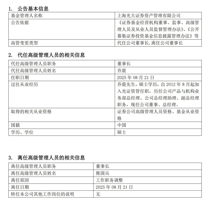值得一提的是,自2014年7月起,熊国兵正式出任光证资管董事长,自此开启了长达11年的掌舵生涯。光证资管前身为光大证券资产管理总部,2012年5月正式成立,是国内上市券商旗下首家资产管理公司,而熊国兵是其成立后的第二任董事长。如今,熊国兵的离任,为其在光证资管的这段漫长旅程画上了句号。光证资管在公告中也特别指出,熊国兵在公司任职期间,为推动业务发展作出了重要贡献,公司给予高度评价并深表感谢。